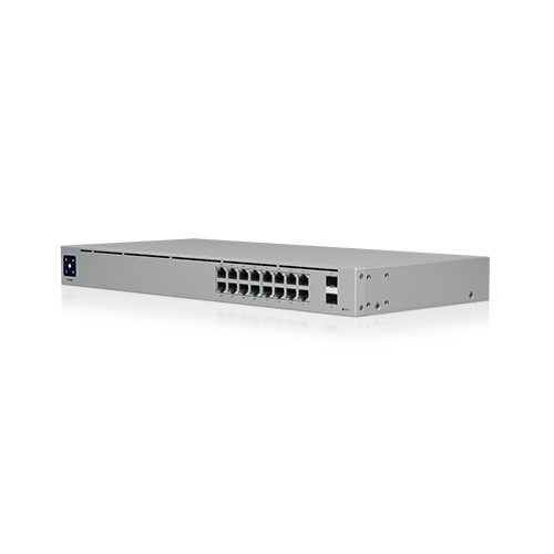 A 16-port, Layer 2 PoE switch with a silent, fanless cooling system.
